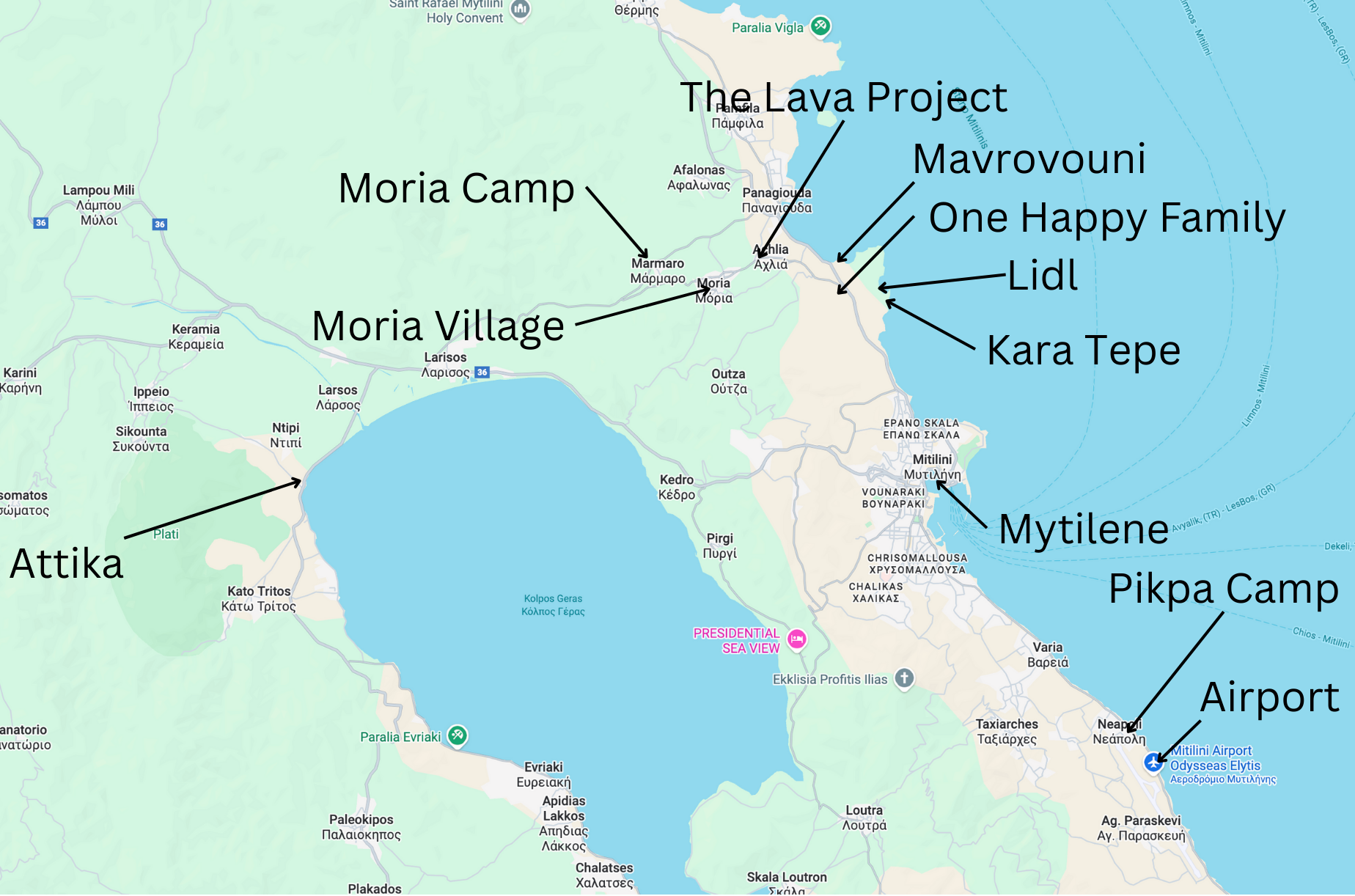 The army base had been built in a shallow valley beside the road connecting Panagiouda and Larisos and was just over a kilometre’s walk from Moria village. From the village it was a further three kms to OHF and walking to the capital of Mytiline by the shortest route - which took you past OHF - was about eight kilometres.