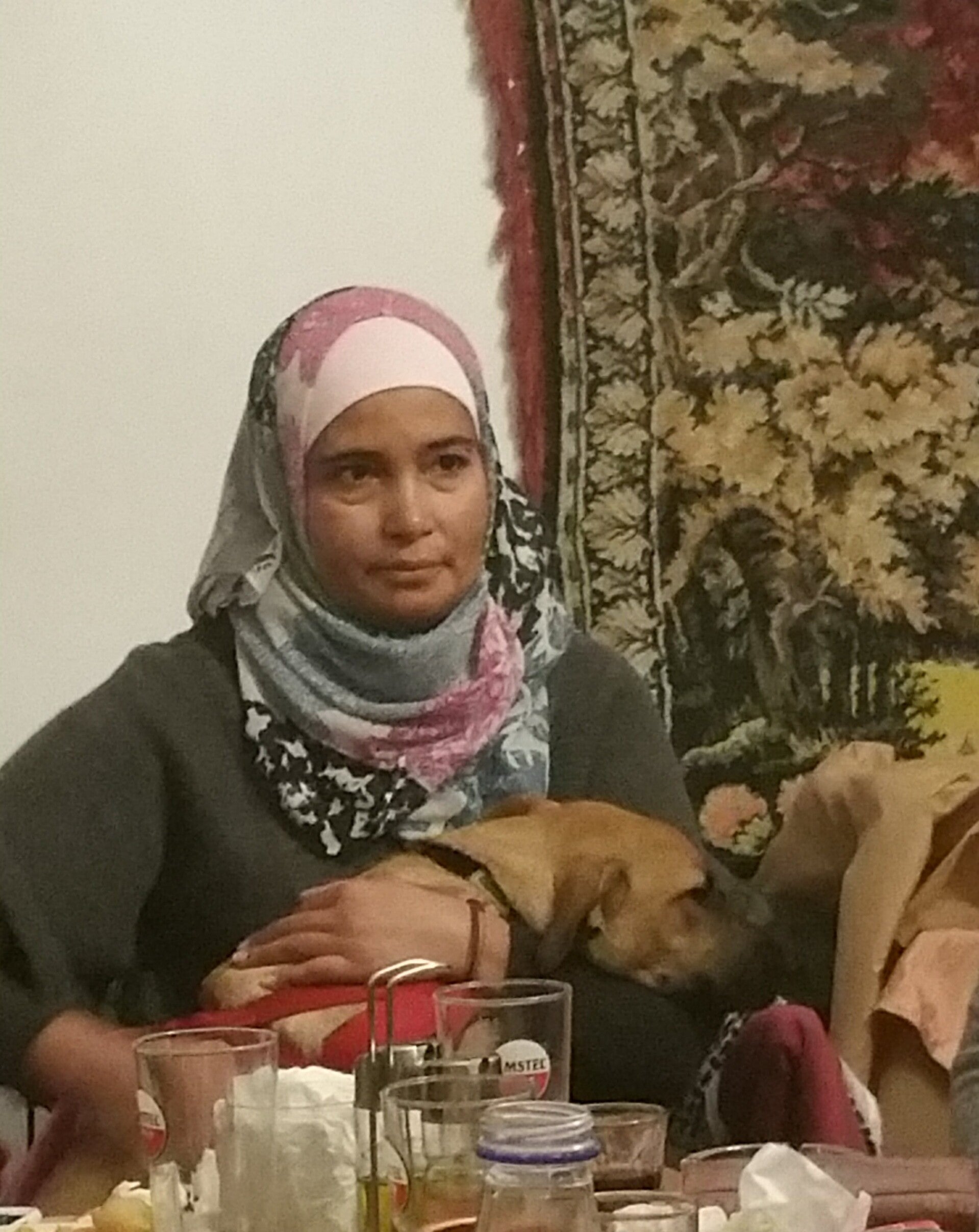 Xmas lunch with her dog on her lap